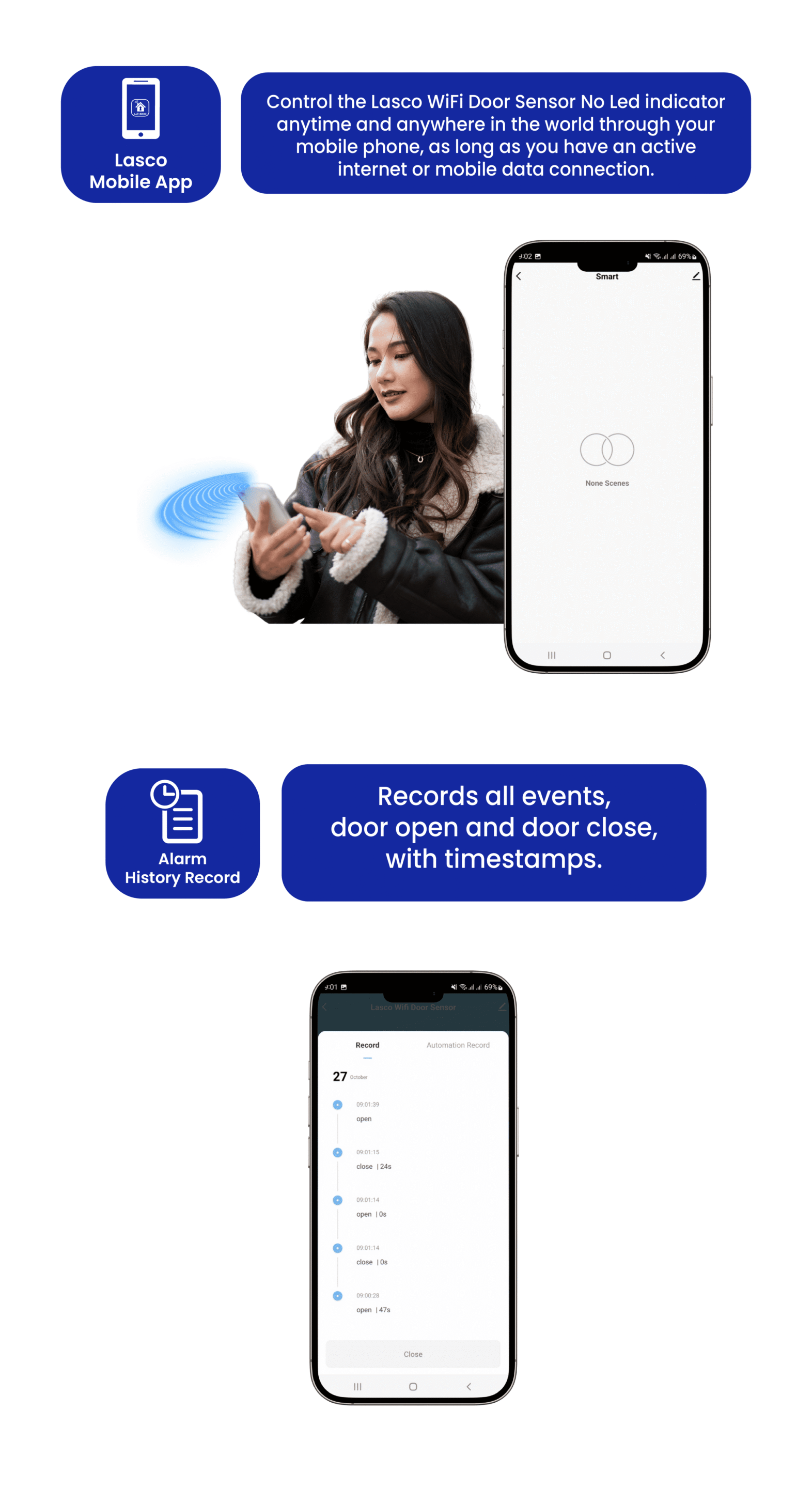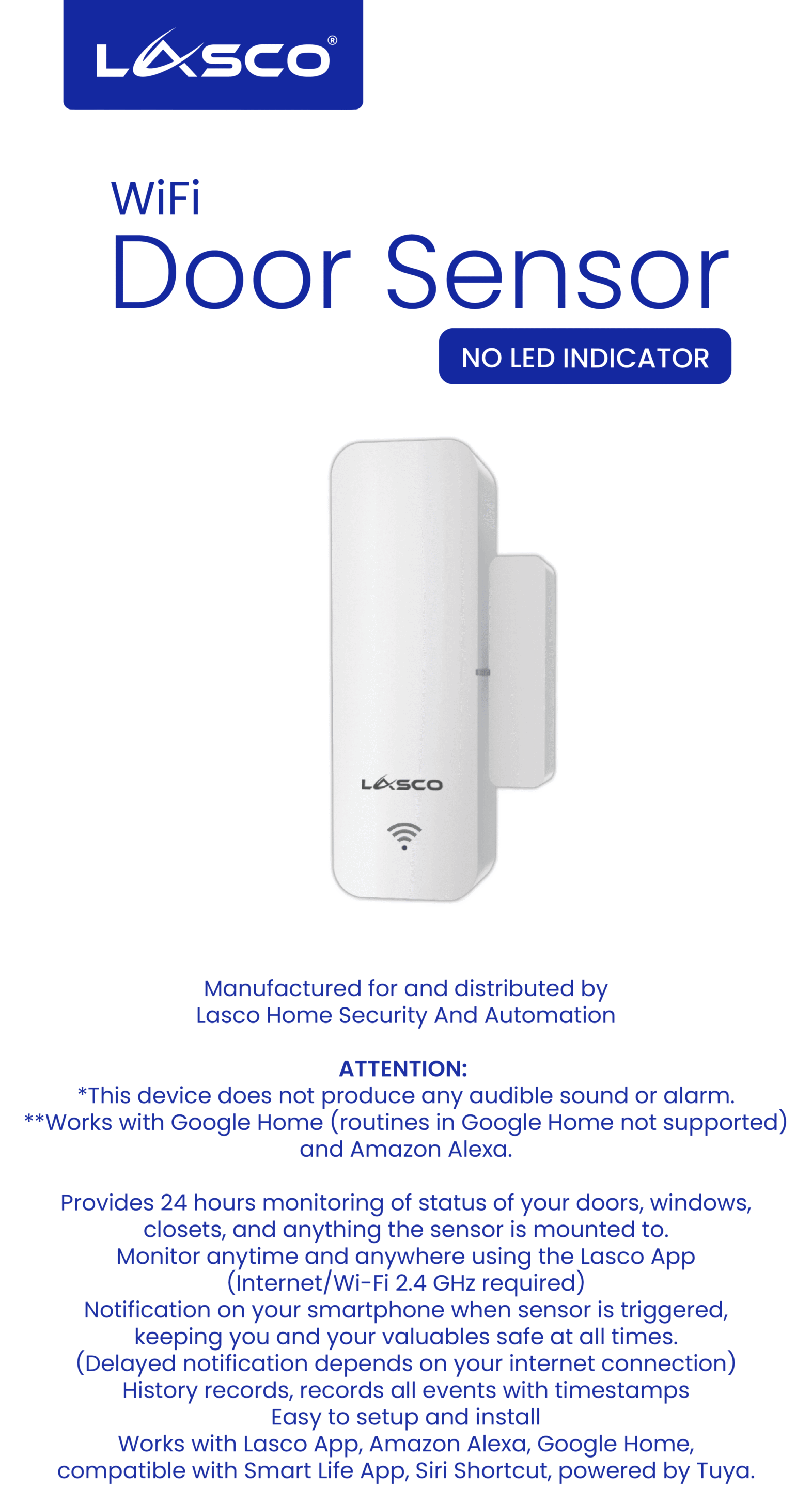 The Lasco WiFi Door Sensor No Led Indicator is the perfect addition to your smart home, offering 24/7 monitoring of doors, windows, closets, and more to ensure your peace of mind. With real-time notifications sent directly to your smartphone via the Lasco App, it keeps you informed anytime and anywhere, no hub required. Compatible with Amazon Alexa, Google Home, and Smart Life, this easy-to-install device seamlessly integrates into your smart ecosystem while requiring only a Wi-Fi 2.4 GHz connection.