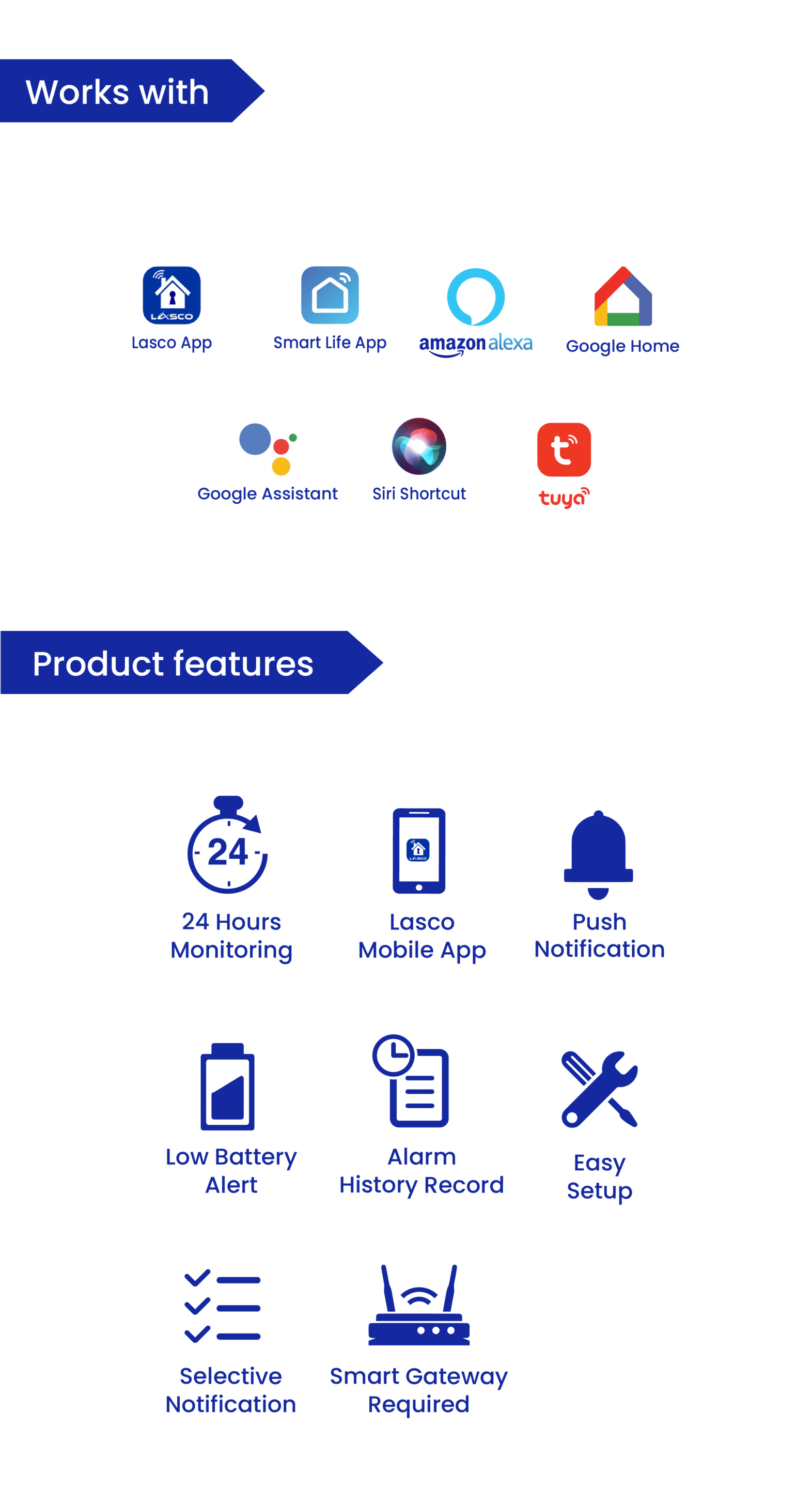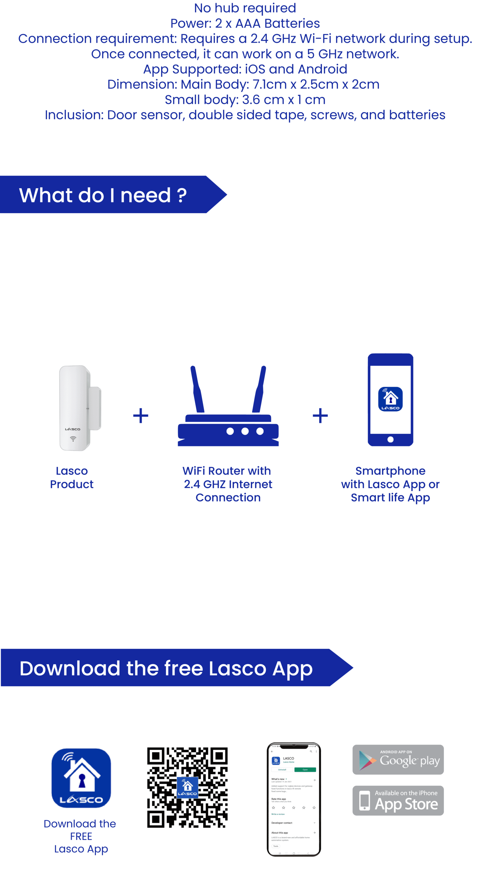 - Monitor anytime and anywhere using the Lasco App (Internet/Wi-Fi 2.4 GHz required)