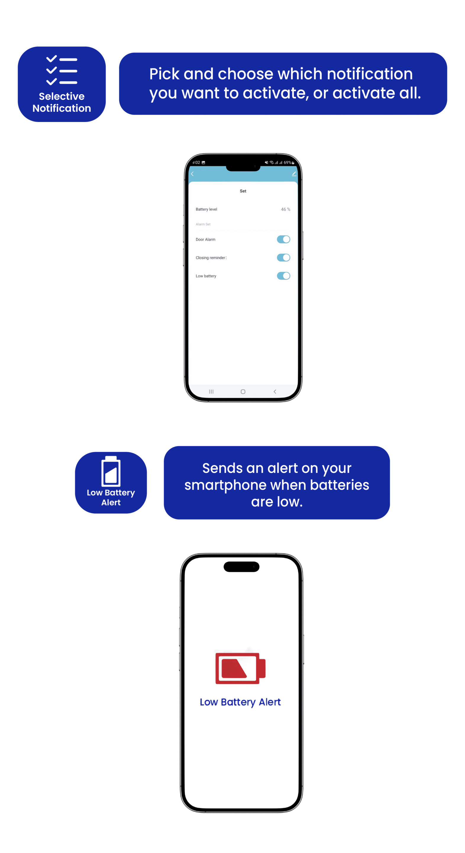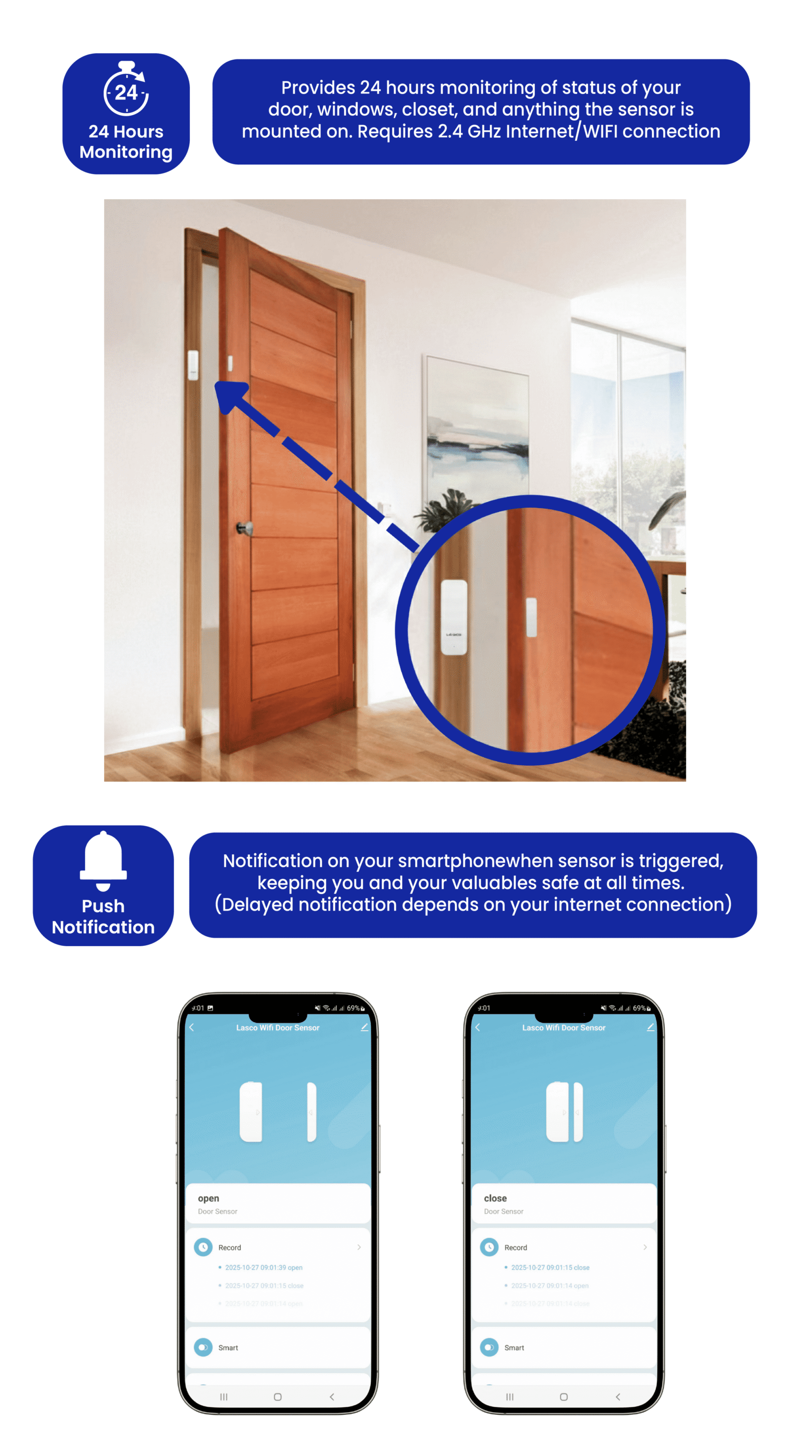 - Notification on your smartphone when sensor is triggered, keeping you and your valuables safe at all times. (Delayed notification depends on your internet connection)