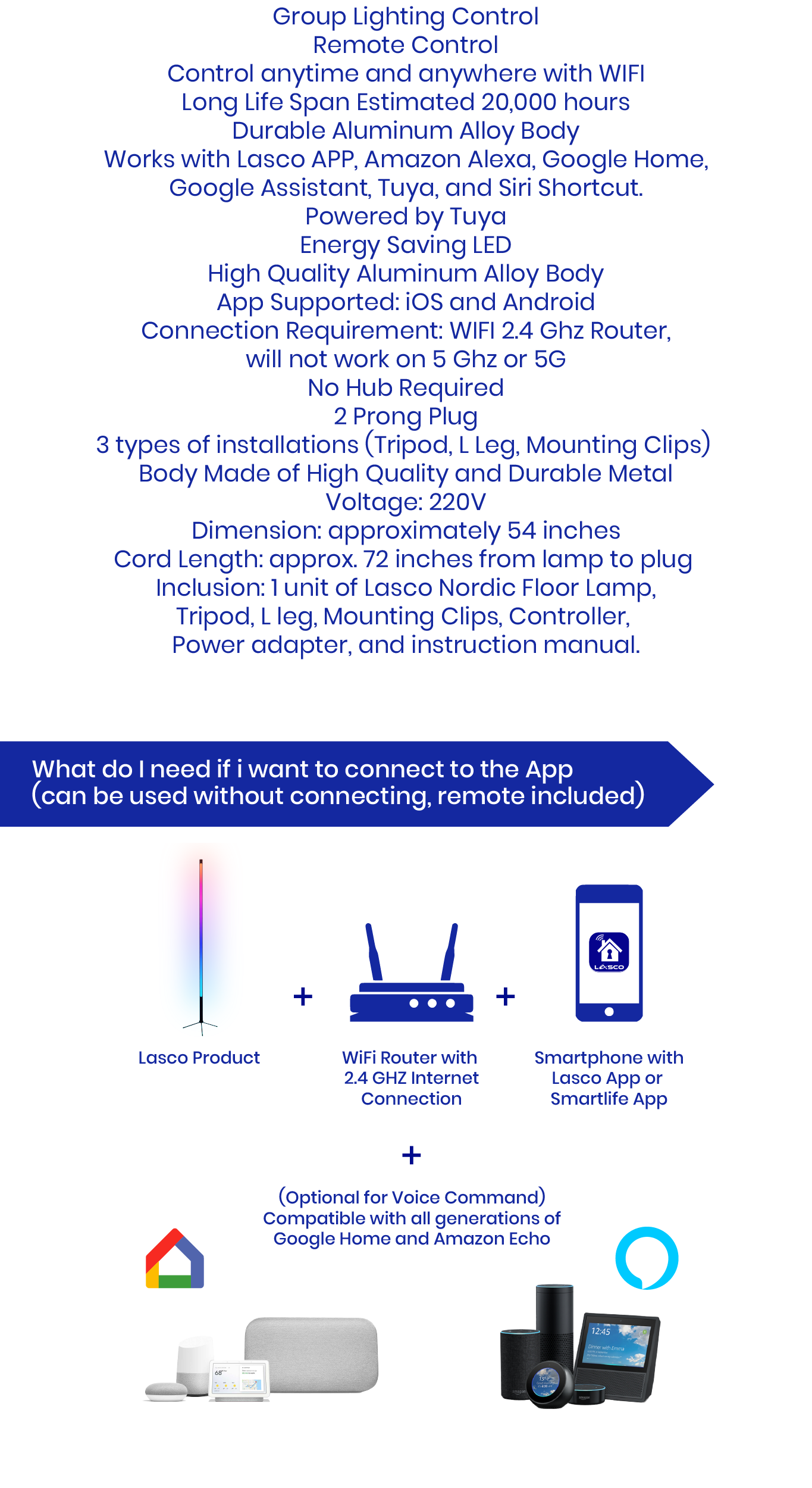✓ Lasco App, Smart Life App, Amazon Alexa, Google Assistant, Google Home, Siri Shortcut, Tuya and Wi-fi.