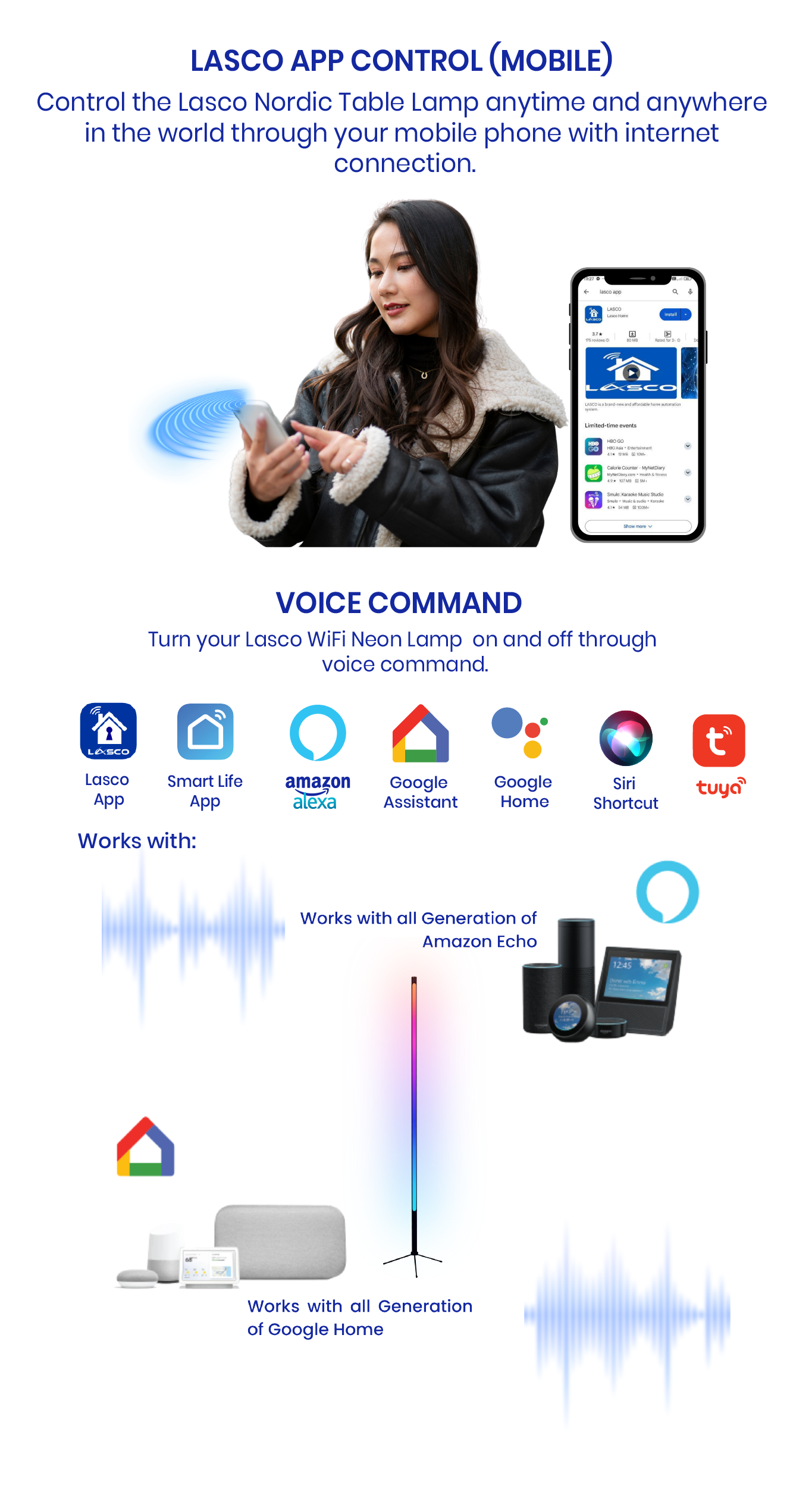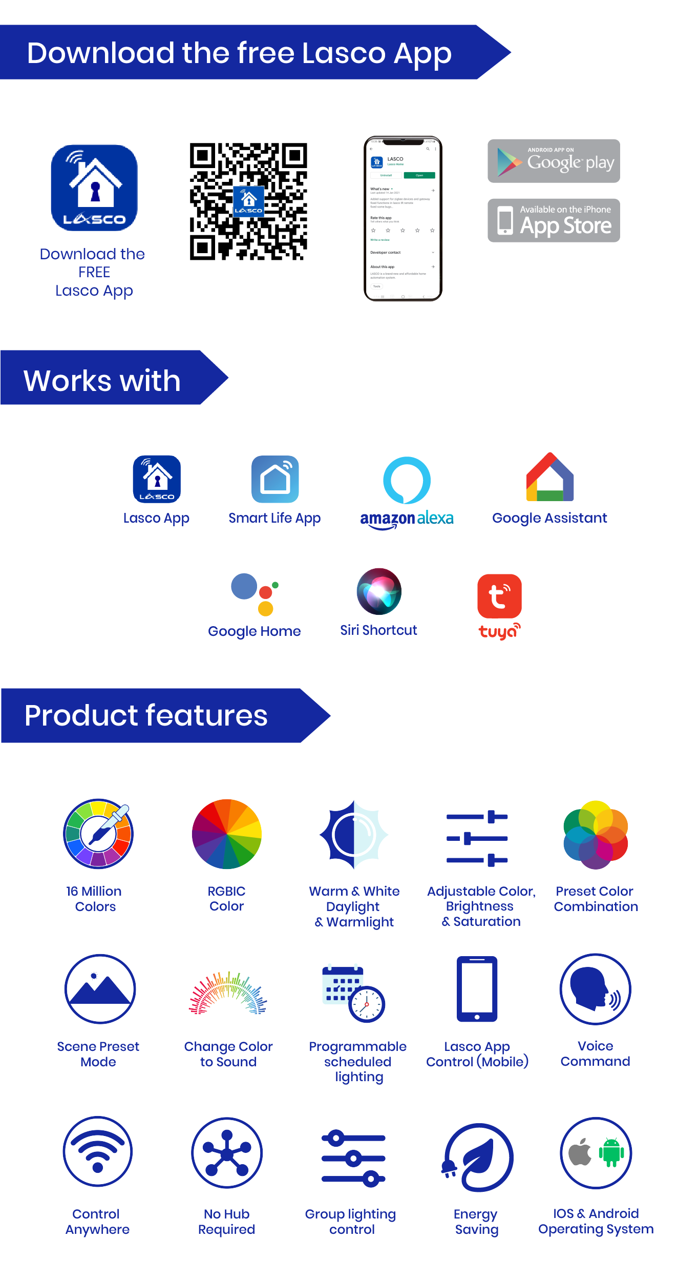 - Works with Lasco App, Amazon Alexa, Google Home, Google Assistant, Tuya, and Siri Shortcut.