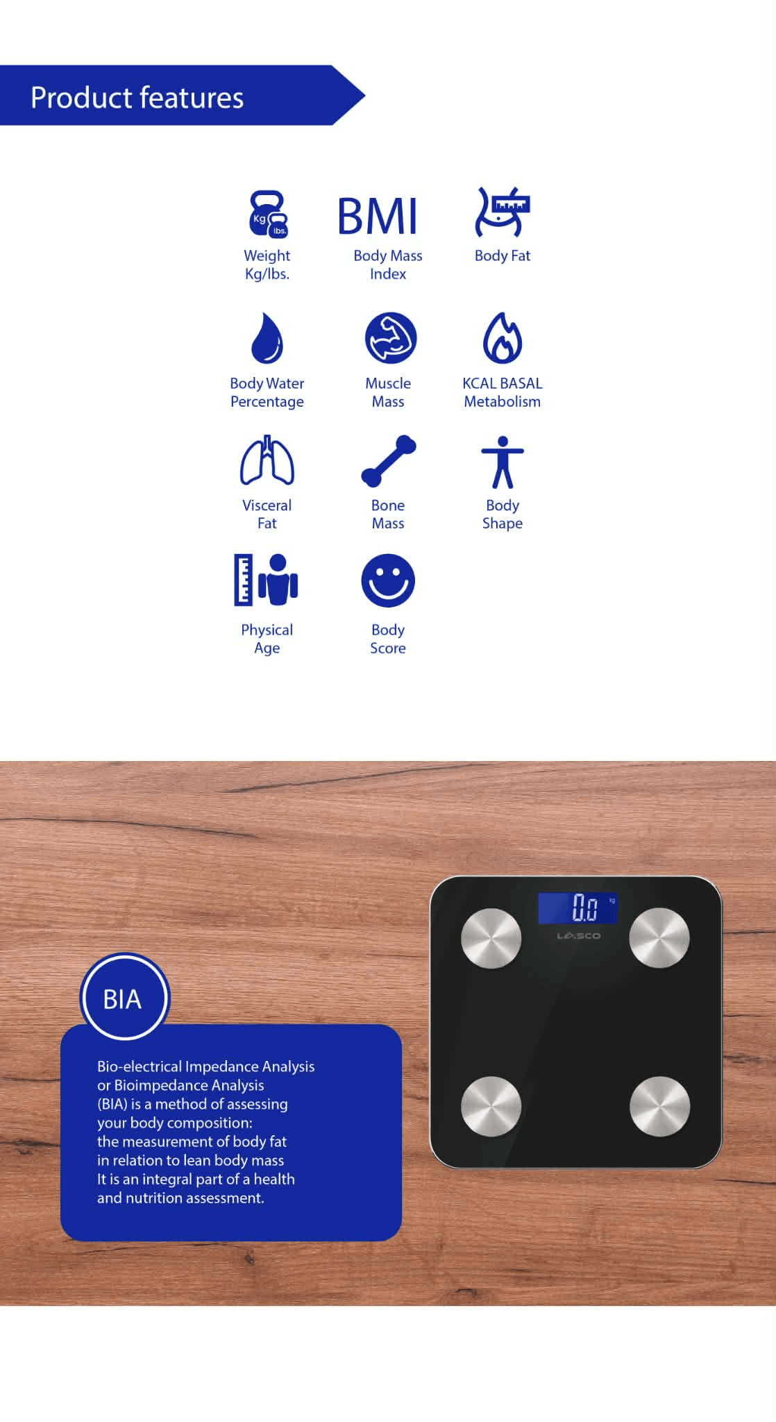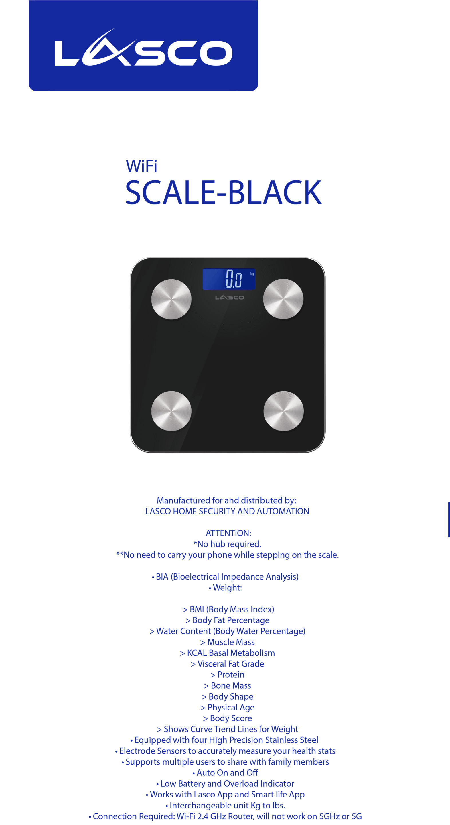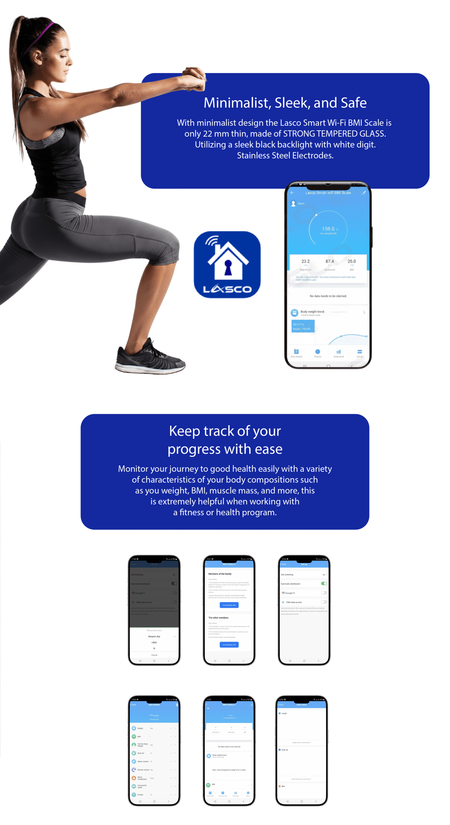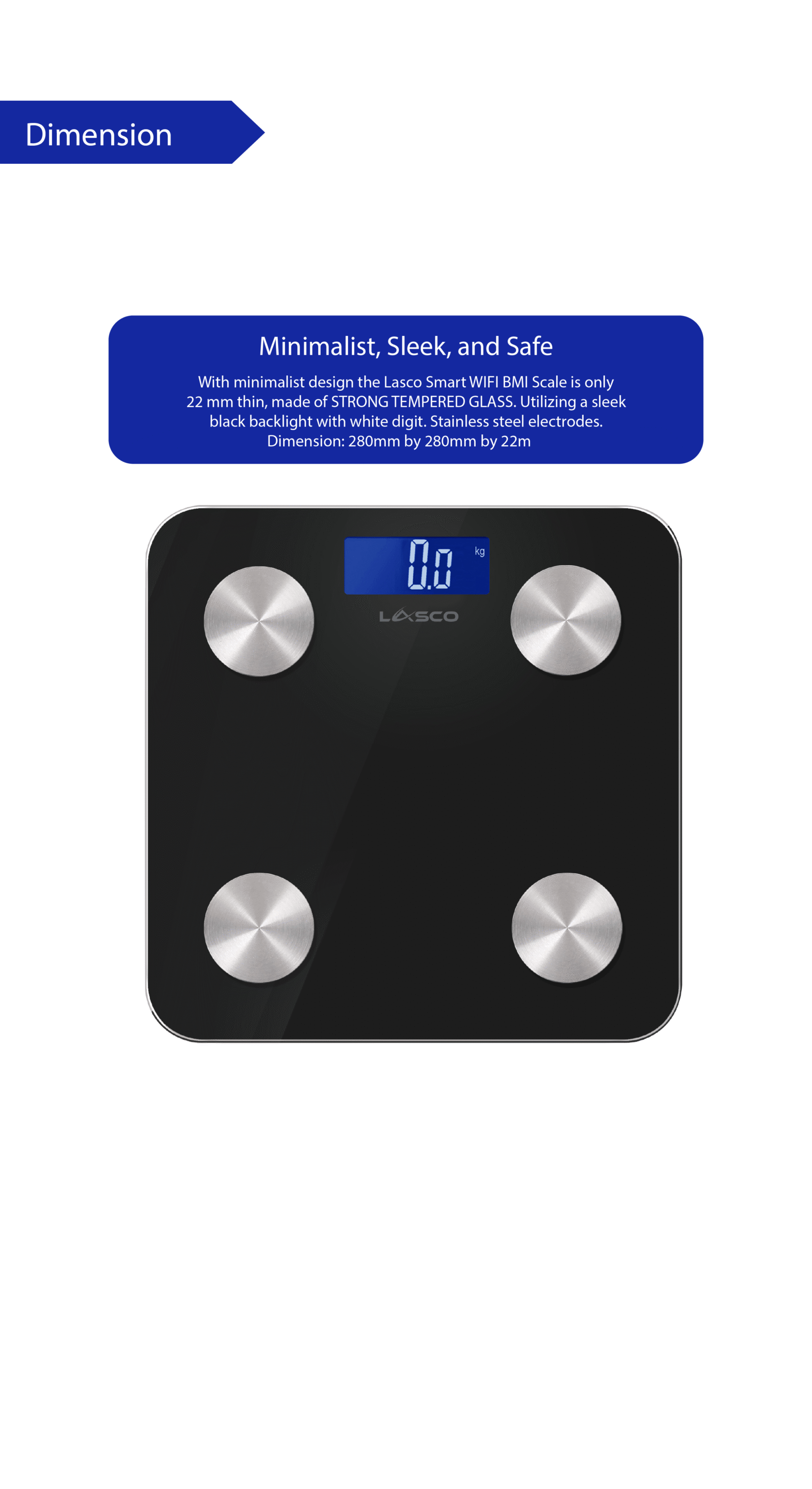 - Minimalist, Sleek and Safe: With minimalist design the Lasco Smart Wi-Fi BMI Scale is only 22 mm thin, made of STRONG TEMPERED GLASS. Utilizing a sleek black backlight with white digit. Stainless Steel Electrodes.