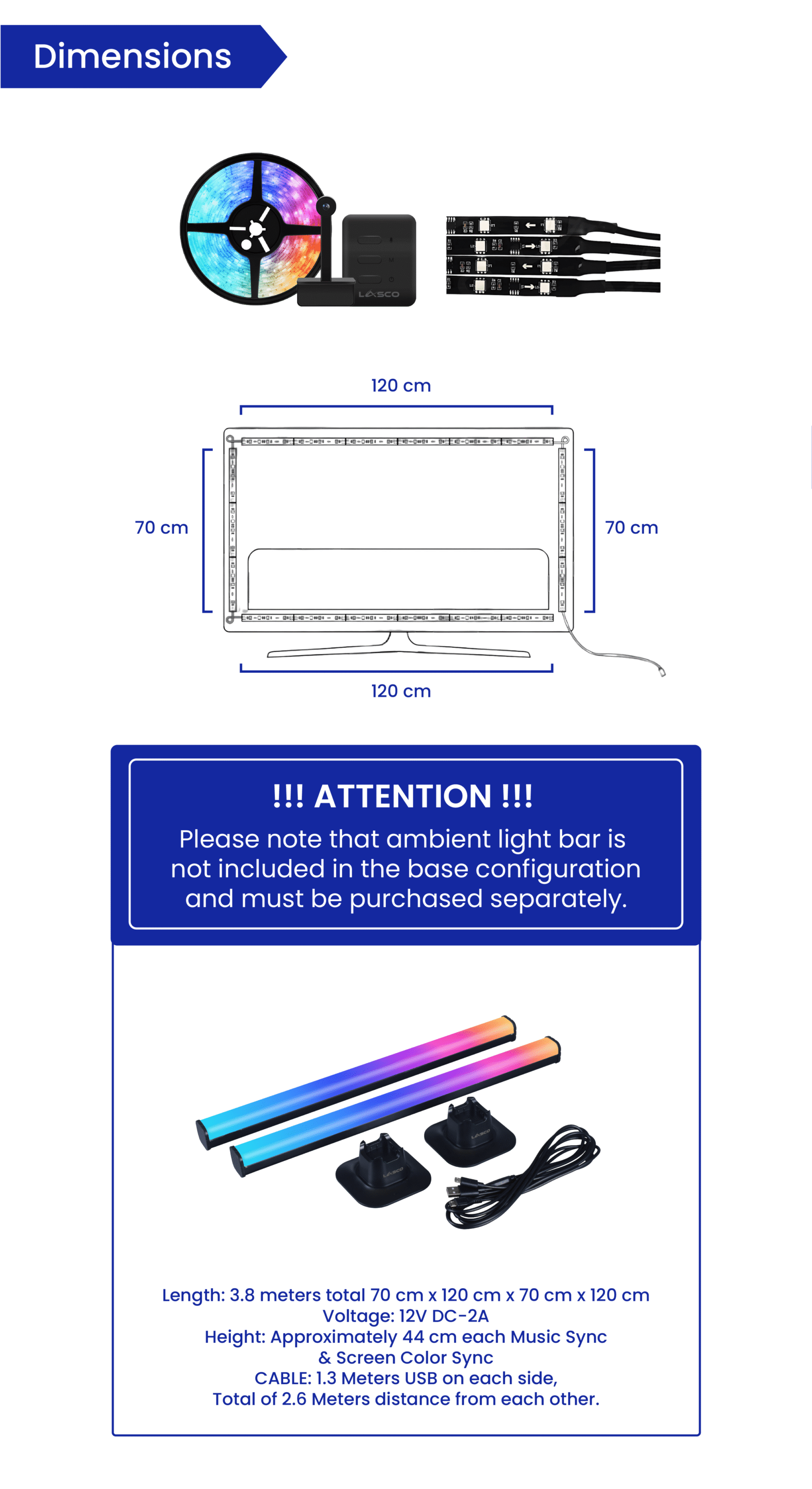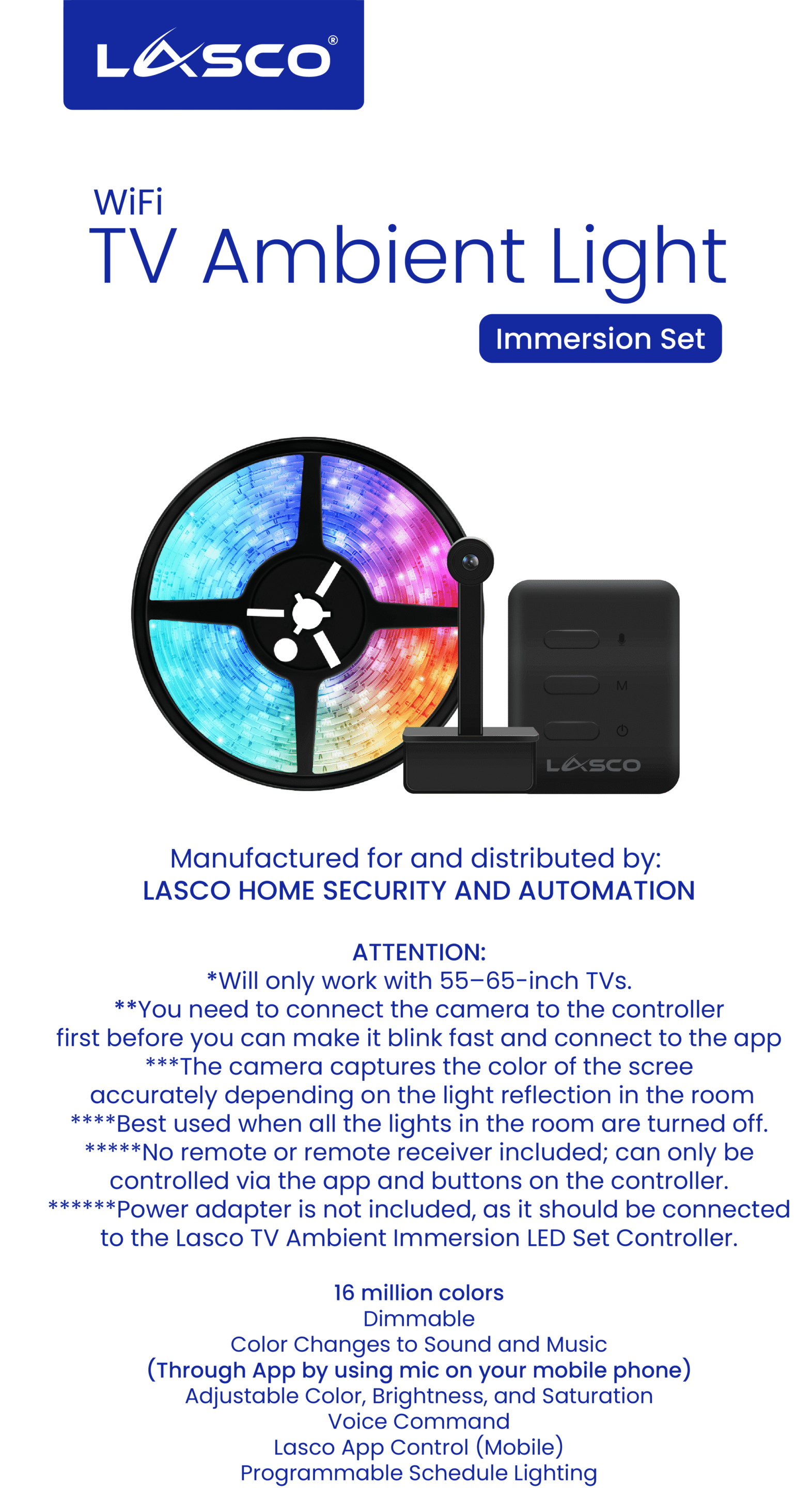 - Power adapter is not included, as it should be connected to the Lasco TV Ambient Immersion LED Set Controller.