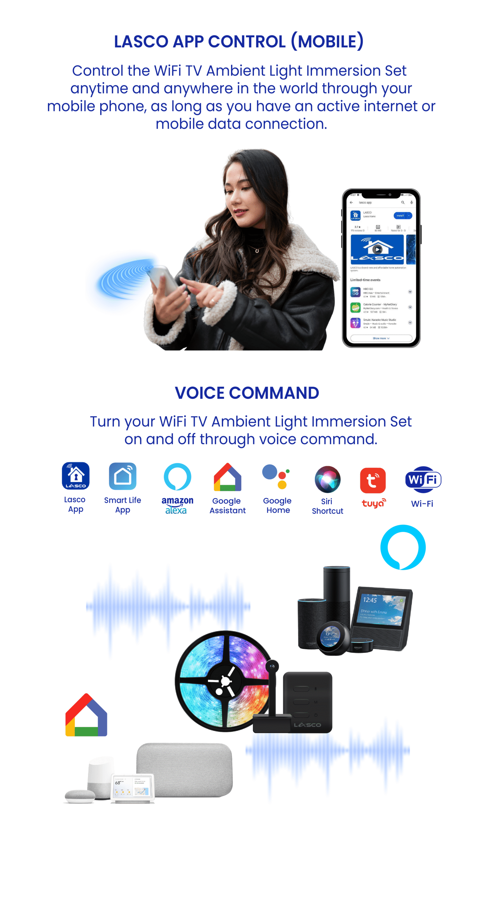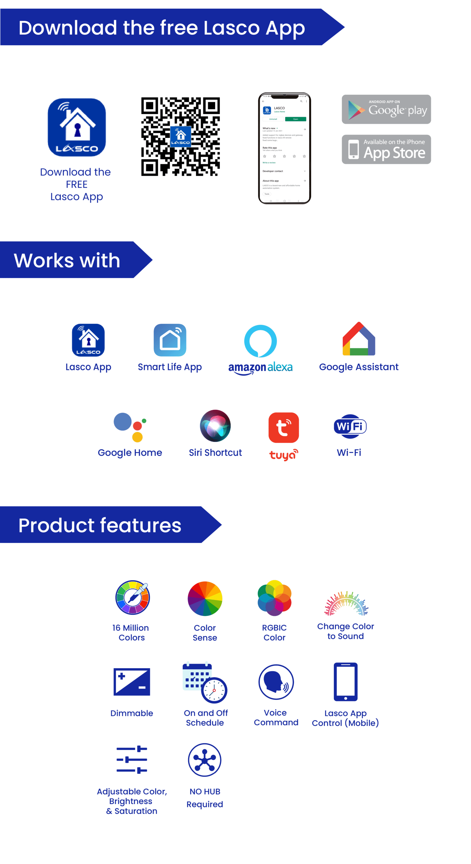 ✓ Lasco App, Smart Life App, Amazon Alexa, Google Assistant, Google Home, Siri Shortcut, and Tuya.