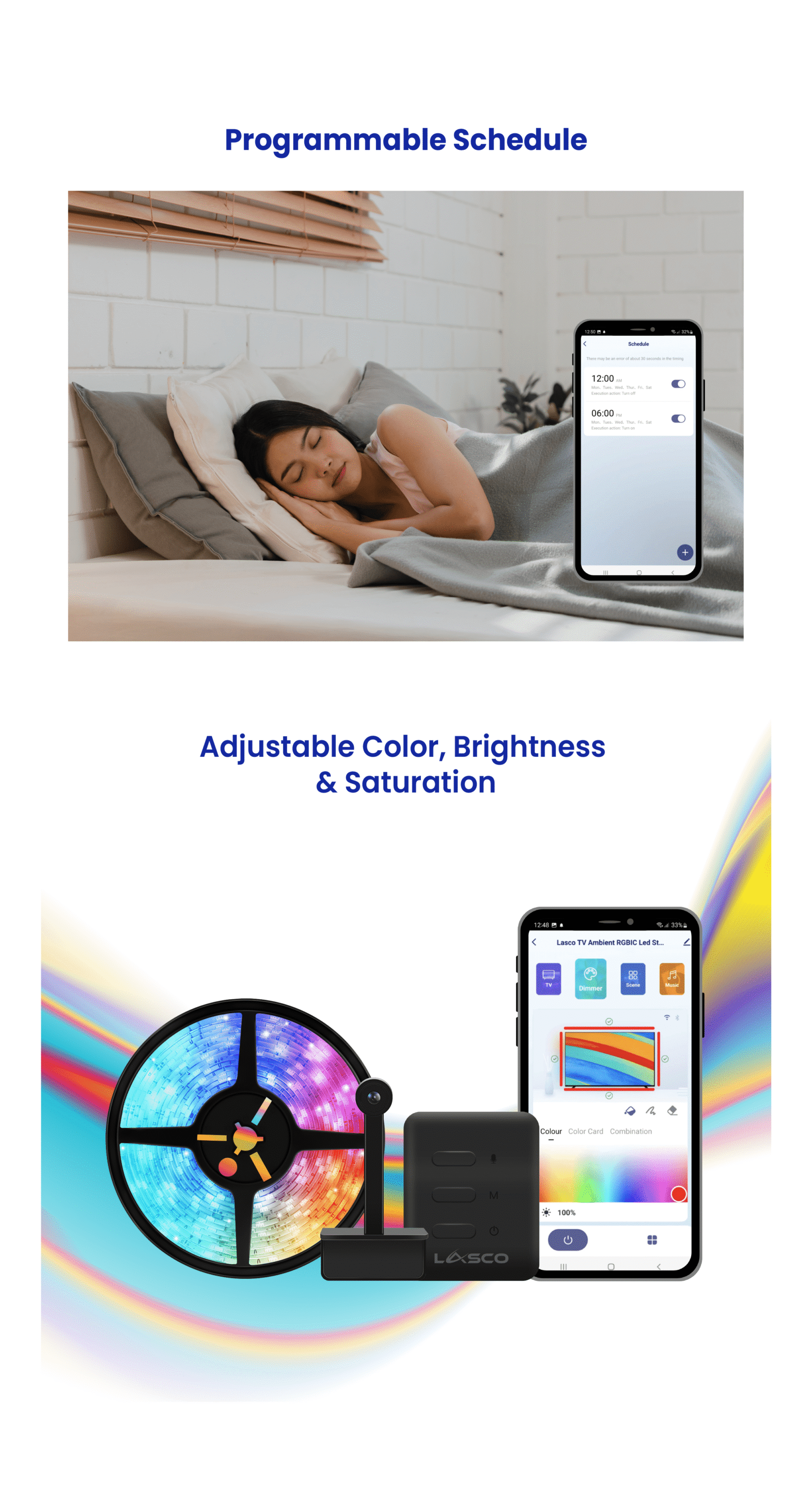 - Schedule: Set On and Off timer to your Lasco Product